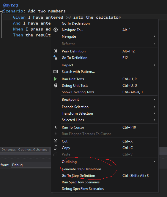 您可以通过右键单击该功能的文本并选择“生成步骤定义”来生成步骤定义。