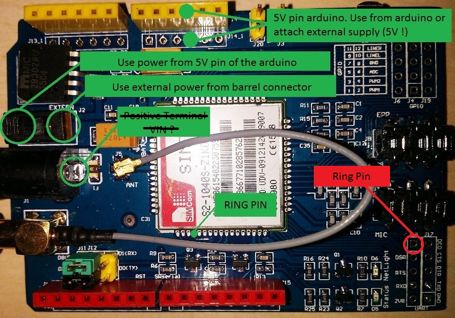 如果您有一个具有连续性测试的万用表,请检查Sim 900芯片上的RI引脚(#4)的位置。以下是引脚的概述: