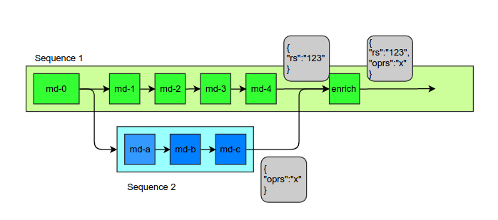 在我的应用程序中,我使用一些中介器(md-1,2,3,4和md,b,c) (调用、脚本、有效负载工厂、数据映射器、迭代器、开关、充实等等)来完成任务。目前,介体md,b,c是在md-1,2,3,4之后依次进行的.md返回的有效载荷丰富了md-4返回的有效载荷。