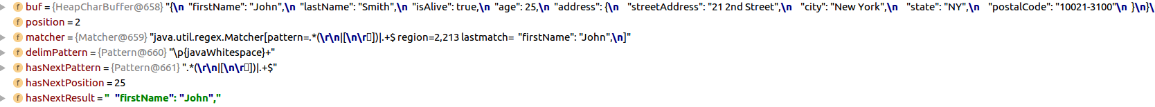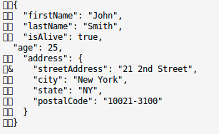 { "firstName":"John","lastName":"Smith","isAlive":true,"age":25,"address":{% "streetAddress":"21 21“,"city":"New York","state":"NY", "postalCode":"10021-3100“}