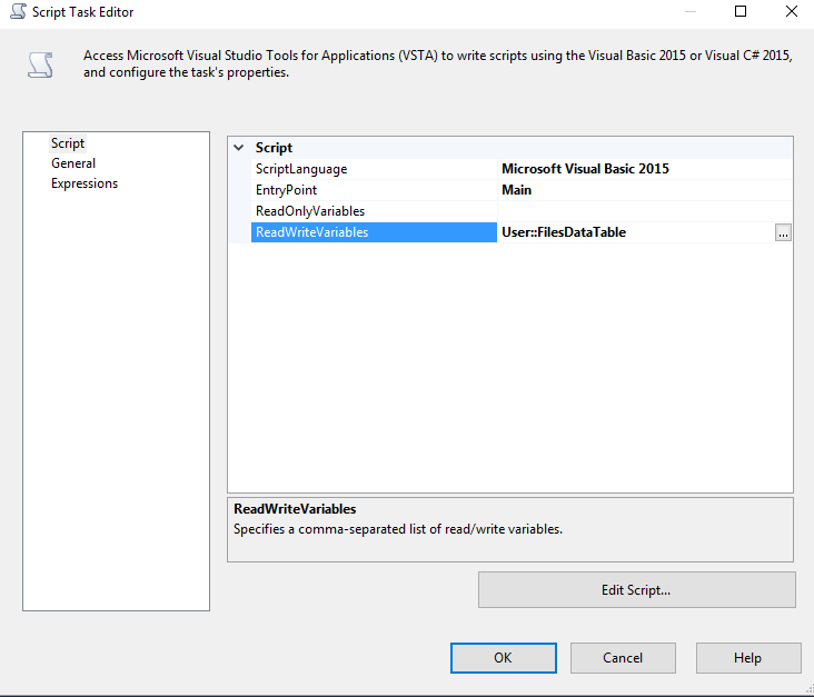 User::FilesList__),它的类型是System.Object (Scope: Package)Execute Script Task,并将User::FilesList添加为ReadWrite变量FilesList变量作为源ScreenShots