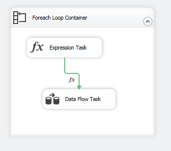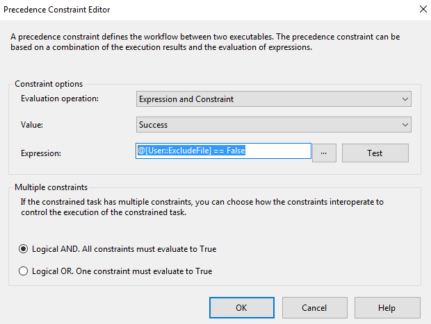 在循环中,将脚本任务放在第一个任务之前。用一条线连接这两条线。右键单击该行并将约束选项设置为表达式。你的表情会像这样..。