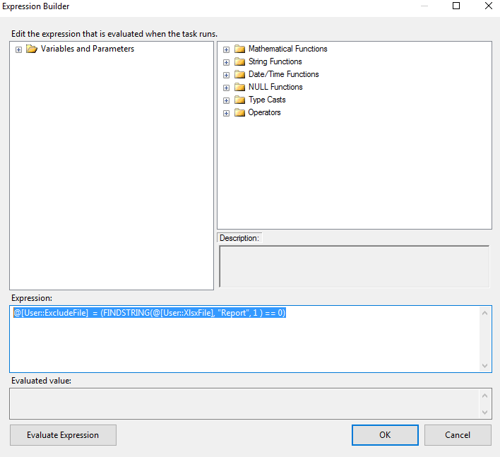 注意:没有必要使用Expression Task来验证这一点,您可以使用虚拟DataFlowTask或脚本任务来检查文件名是否包含要排除的关键字。