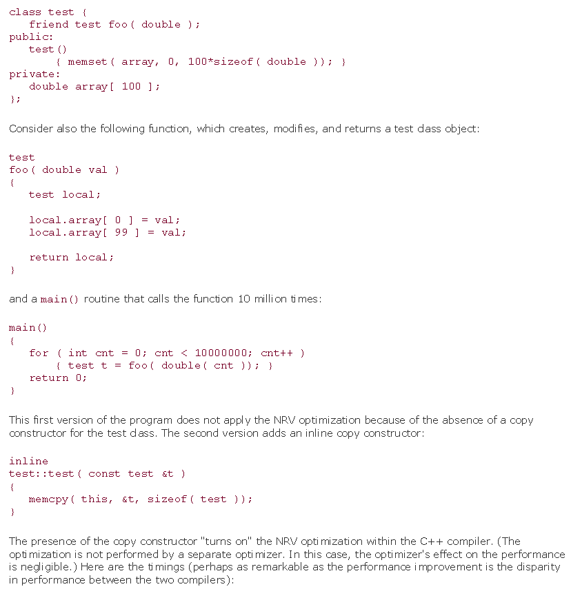 如我所知,NRVO不会调用类的复制构造函数--函数returns.So --我不明白为什么“程序的第一个版本没有应用NRV优化,因为没有副本构造函数.”。