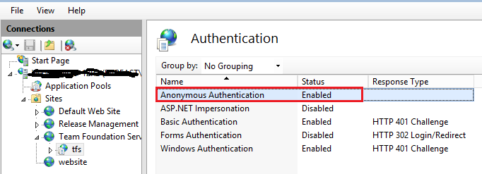 在您的TFS服务器上,启用了-> (IIS)管理器、->身份验证、->更改、匿名身份验证。