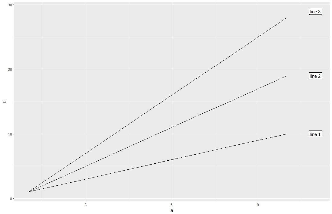 geom_label(aes(10,29), label = "line 3", nudge_x = 1)您可以直接输入与所需的标签位置相对应的顺序对。情节如下: