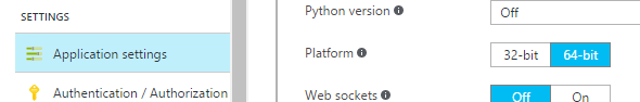 在Azure门户中的应用程序设置中,我将平台设置为64位: