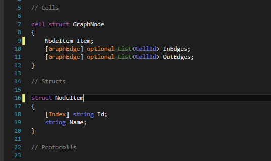 我的TSL文件如下所示:图节点由一个NodeItem组成,它只是一个具有属性Id和名称的容器。该节点具有用于传出关系的OutEdges和用于传入关系的InEdges。