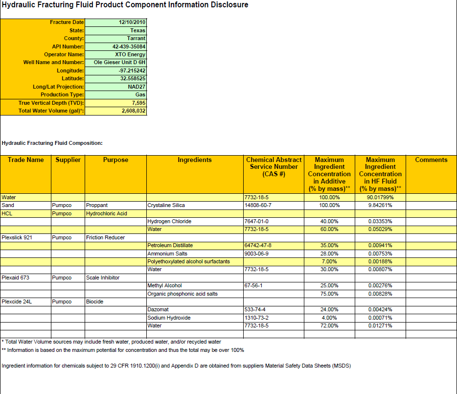 涉及29 CFR 1910.1200(i)和附录D的化学品的不方便信息来自供应商材料安全数据表*信息基于最大浓度潜力,因此总量可能超过100%*水资源总量可能包括淡水、产出水,和/或回收water0.01271%72.00%7732-18-5Water0.00071%4.00%1310-73-2Sodium Hydroxide0.00424%24.00%533-74-4DazomatBiocidePumpcoPlexcide 24L0.00828%75.00%有机膦酸盐0.00276%25.00%67-56-1甲醇AlcoholScale InhibitorPumpcoPlexaid 6730.00807%30.00%7732-18-5Water0.00188%7.00%Polyethoxylated醇类表面活性剂0.00753%28.00%9003-06-9Ammonium Salts0.00941%35.00%64742-47-8石油9210.05029%60.00%7732-18-5Water0.03353%40.00%7647-01-0Hydrogen AcidPumpcoHCL9.84261%100.00%14808-60-7Crystaline SilicaProppantPumpcoSand90.01799%100.00%7732-18-5WaterCommentsMaximumIngredientConcentrationin HF流体(按质量计)**极大值浓缩剂(按质量计)**化学AbstractService数(CAS #)IngredientsPurposeSupplierTrade NameHydraulic压裂液组成:2,608,032总水量(Gal)*:7,595真垂直深度(TVD):产气类型:NAD27Long/Lat投影:32.558525纬度-97.215242经度:Ole Gieser单元D 6井名称和编号:XTO EnergyOperator名称:42-439-35084API DateHydraulic压裂液产品成分信息披露