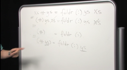= (++) xs ys = ...如果您查看视频的注释,您会注意到这个汤姆·洛霍斯特指出了这个错误(包括其他几个)。。