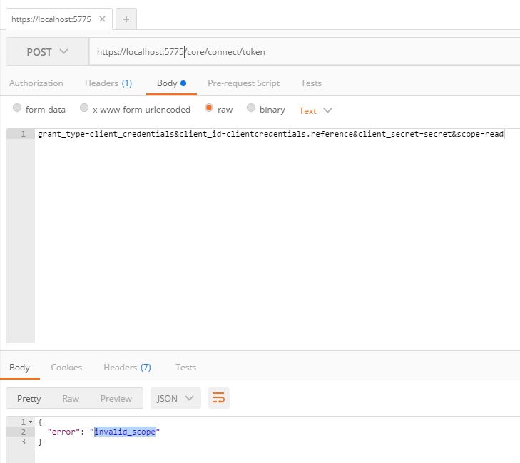}我在本地IIS中承载了令牌服务,并试图使用Postman来ping令牌,但是它给出了一个错误{"error":"invalid_scope"}