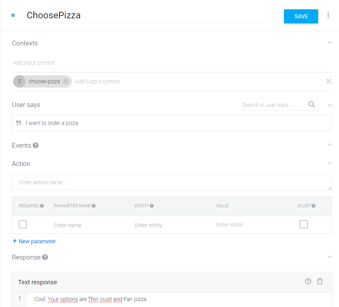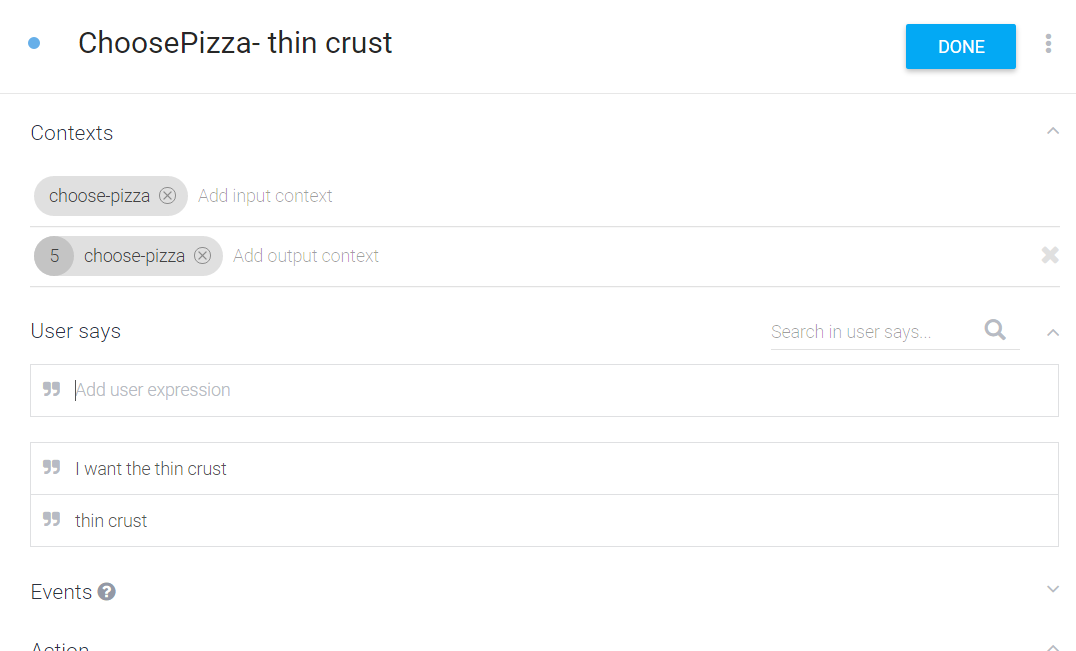 然后,您将为每个选项创建意图:ChoosePizza - thin crust和ChoosePizza- pan pizza,并将Select-Piza设置为输入上下文。