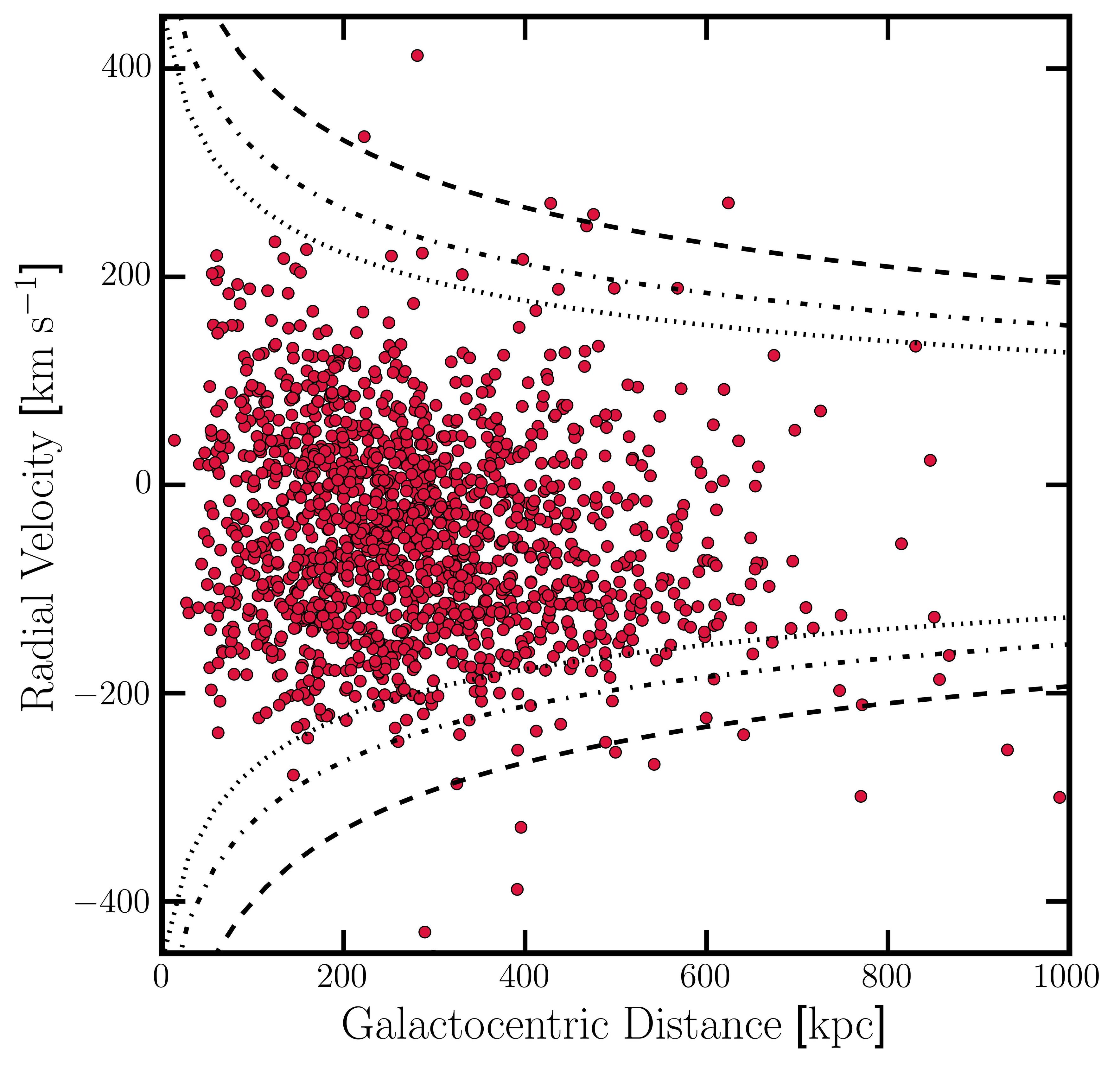 图中的值来自数据集的分析,我们可以将RadVel称为y轴值“径向速度”,Dist称为x轴值“以银河为中心的距离”。