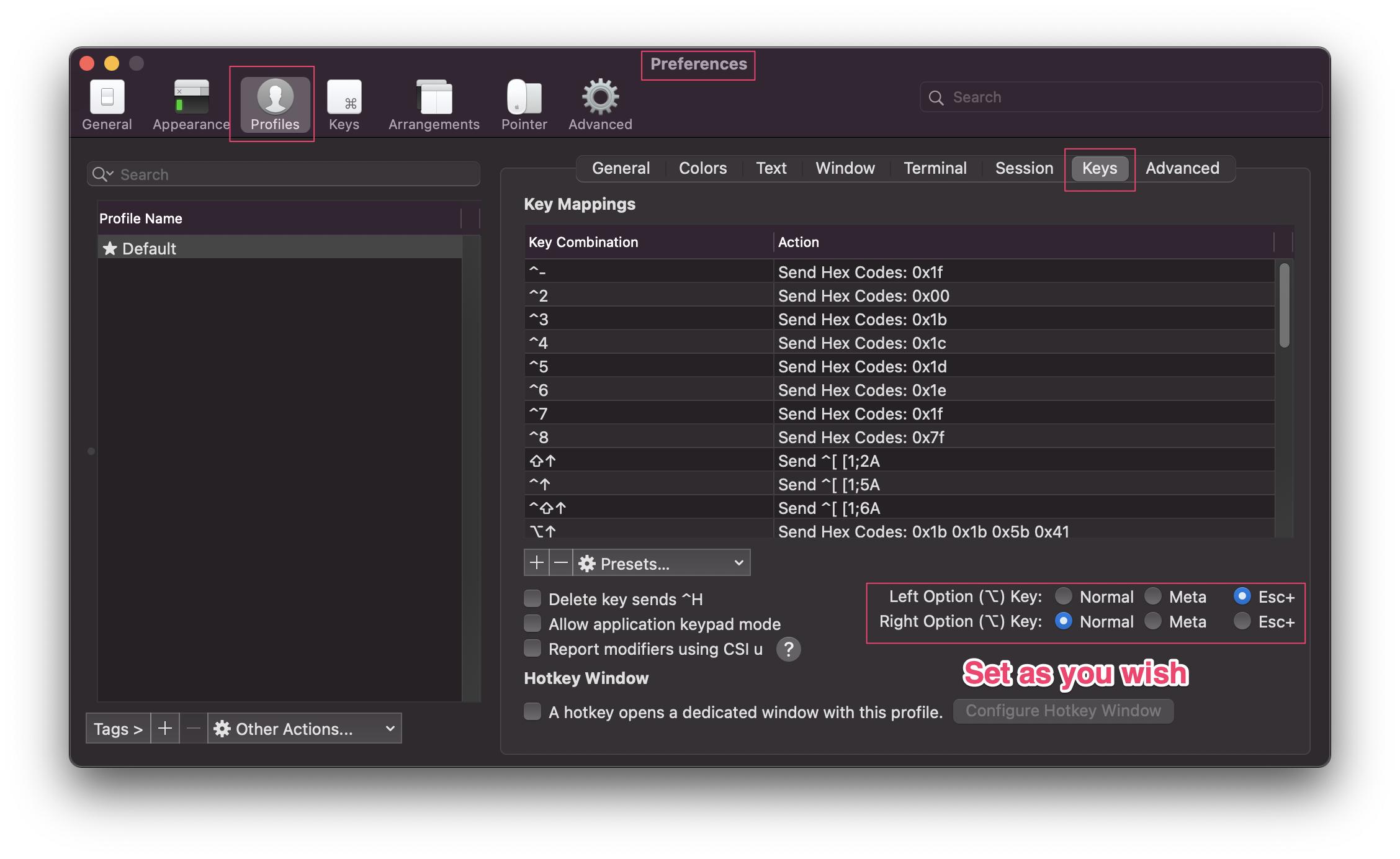 我把键盘退出映射到C,这很好。在Terminal.app的编辑菜单中设置"Use“(该菜单还添加了一个按钮以方便切换此行为)和映射键盘--退出--我认为我很适合这样做。