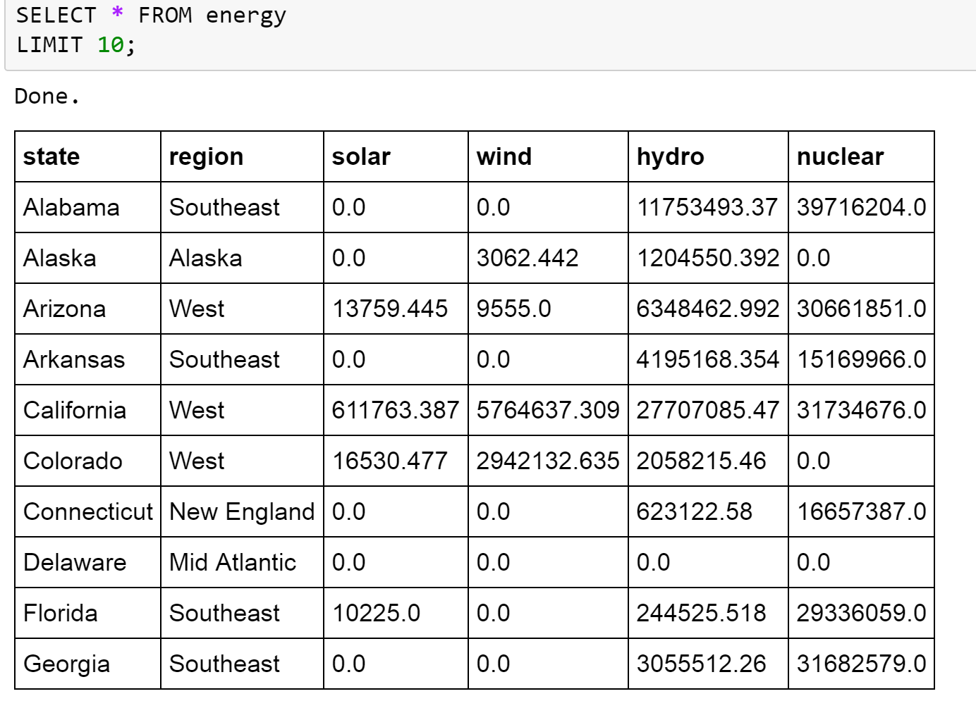 create table states (stateid int, wind double, solar double, primary key (stateid))
