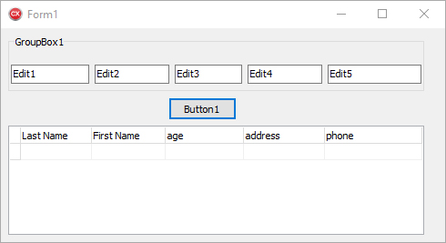 我创建了一个包含5 TGroupBox、TButton和TDBGrid的TButton。当我单击TEdits时,我想在TDBGrid的最后一行中添加五个TButton的内容。