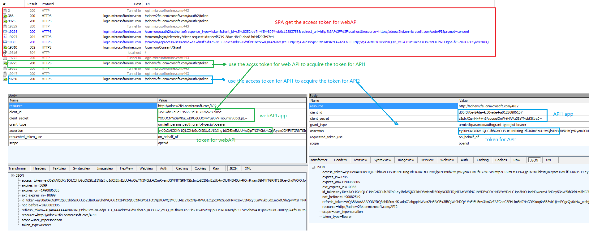 要使用代理流,我们需要为 API1 提供访问令牌,并提供clientId和secrect of API1来请求API2的访问令牌。
