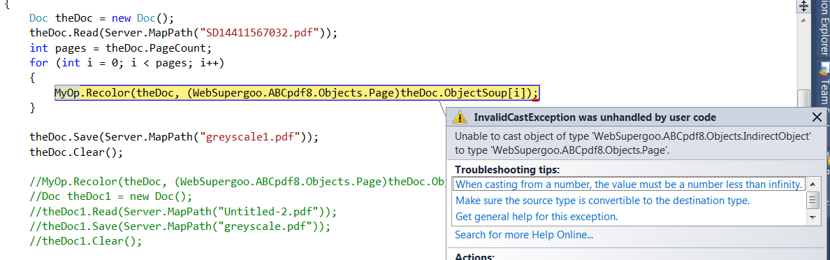 MyOp.Recolor(theDoc, (WebSupergoo.ABCpdf8.Objects.Page)theDoc.ObjectSoup[theDoc.Page]); //Here problem