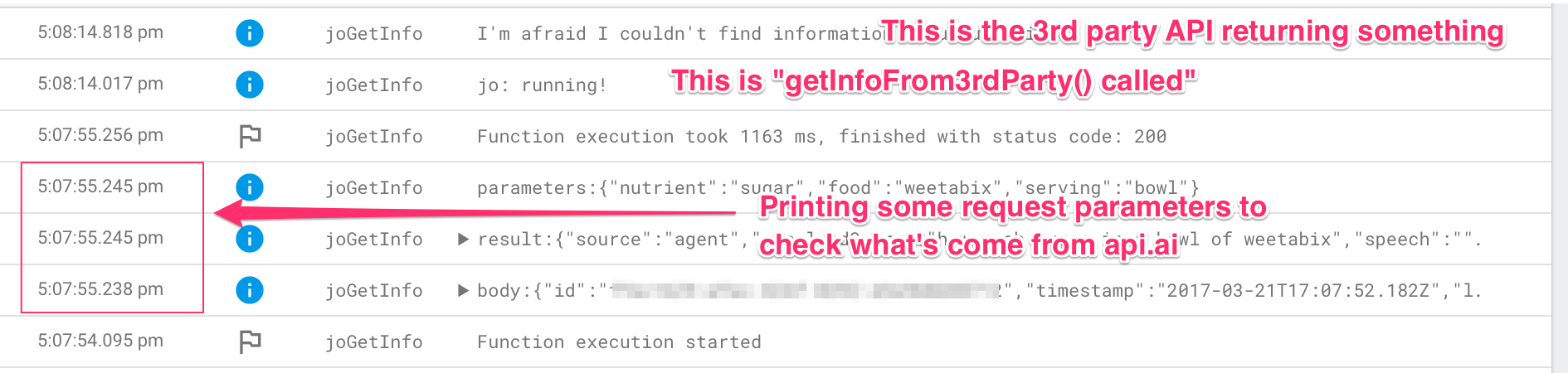通过将简单的注释记录到控制台,我可以看到函数何时启动、次要函数何时被调用以及它何时收到来自第三方的响应,因此我想我可以看到发生了什么。