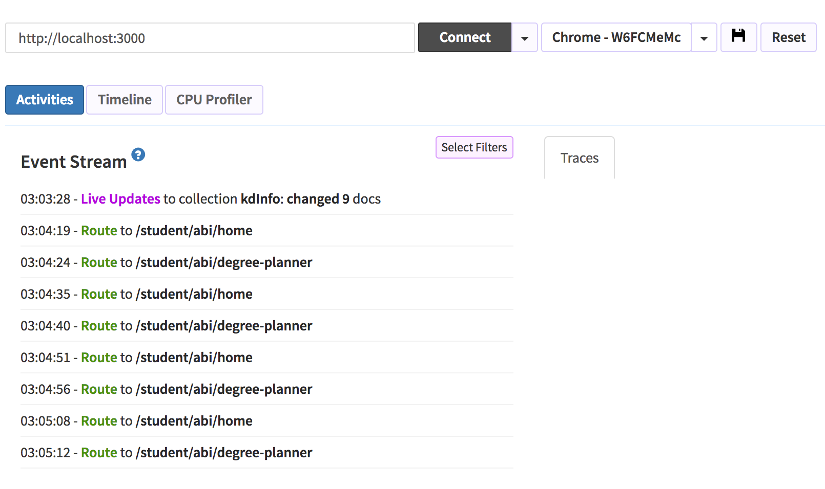 考虑到这是订阅的一个问题,我们为订阅缓存实现了SubsManager。通过对Kadira的分析,我们现在知道订阅是缓存的,而这并不是页面显示时间慢的原因;在"home“页和”学位规划师“页面之间来回浏览显示一致的多秒钟等待时间,但没有订阅相关事件: