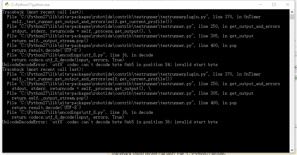 追溯(最近一次调用):文件"C:\Python27\lib\site-packages\robotide\contrib\testrunner\testrunnerplugin.py",行370,在OnTimer self._test_runner.get_output_and_errors(self.get_current_profile()) "C:\Python27\lib\site-packages\robotide\contrib\testrunner\testrunner.py",第250行中,在get_output_and_errors stdout中,在stderr中,返回代码= self._process.get_output(),文件"C:\Python27\lib\site-packages\robotide\contrib\testrunner\testrunner.py",行305,get_output返回self._output_stream.pop()文件"C:\Python27\lib\site-packages\robotide\contrib\testrunner\testrunner.py",行400,pop返回result.decode('UTF-8')文件"C:\Python27\lib\encodings\utf_8.py",第16行,在解码返回codecs.utf_8_decode(输入、错误、真实) UnicodeDecodeError:'utf8‘编解码器无法解码字节0xb5的位置84:无效的开始字节回溯(最近一次调用):文件的utf8行370,在self._test_runner.get_output_and_errors(self.get_current_profile())文件"C:\Python27\lib\site-packages\robotide\contrib\testrunner\testrunner.py",第250行中,在get_output_and_errors stdout中,stderr中,返回代码= self._process.get_output(),\ "C:\Python27\lib\site-packages\robotide\contrib\testrunner\testrunner.py",行305,在"C:\Python27\lib\site-packages\robotide\contrib\testrunner\testrunner.py",get_output返回self._output_stream.pop() self._output_stream.pop第400行,在pop返回result.decode('UTF-8')文件"C:\Python27\lib\encodings\utf_8.py",第16行,在解码返回codecs.utf_8_decode(输入,错误,真实) UnicodeDecodeError:'utf8‘编解码不能解码字节0xb5的位置36:无效的开始字节