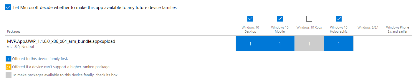 在这里你可以看到你可以选择‘让微软决定.’。对于您的场景,您可能需要取消检查。此外,正如您可以看到的,您可以选择要发布到的平台,并且在您的场景中您只能选择Windows10Mobile。