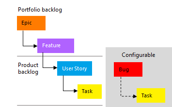 在敏捷/Scrum模板中,特性也可以映射到Epic。您还可以添加许多任务作为用户故事的子级。它们之间的关系如下图所示。