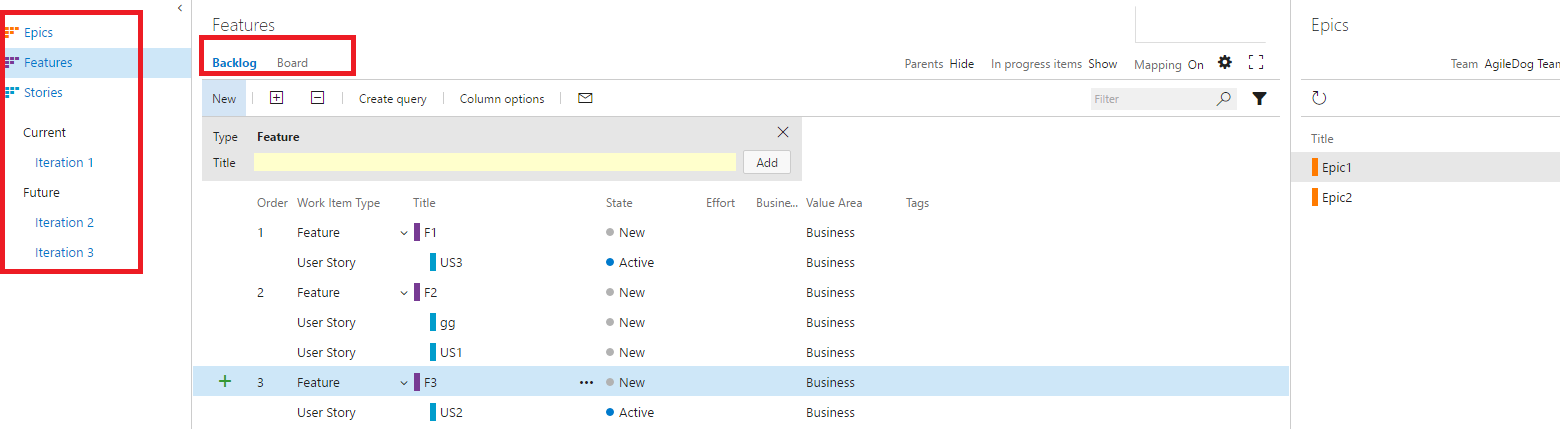 在TFS中,它为您提供了许多跟踪工作项的板。你可以从那些板上找到映射关系。在板中,您可以找到该特性下的哪些用户故事,等等。