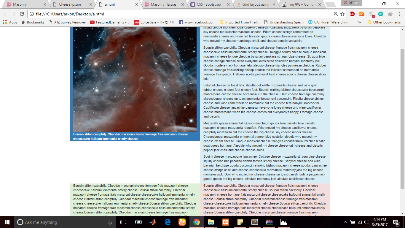 问题是,中间有很多负面的空间。我想要一个级联的网格布局,就像砖石做什么,也响应调整元素的大小,这是很容易使用引导列。我知道这可以使用很多媒体查询来完成,但我想知道是否有一种方法可以将引导和砖石结合起来,从而以最小的努力达到效果。仅仅将这两个类用于引导和砖石并不有效,因为到目前为止,这是我所拥有的: