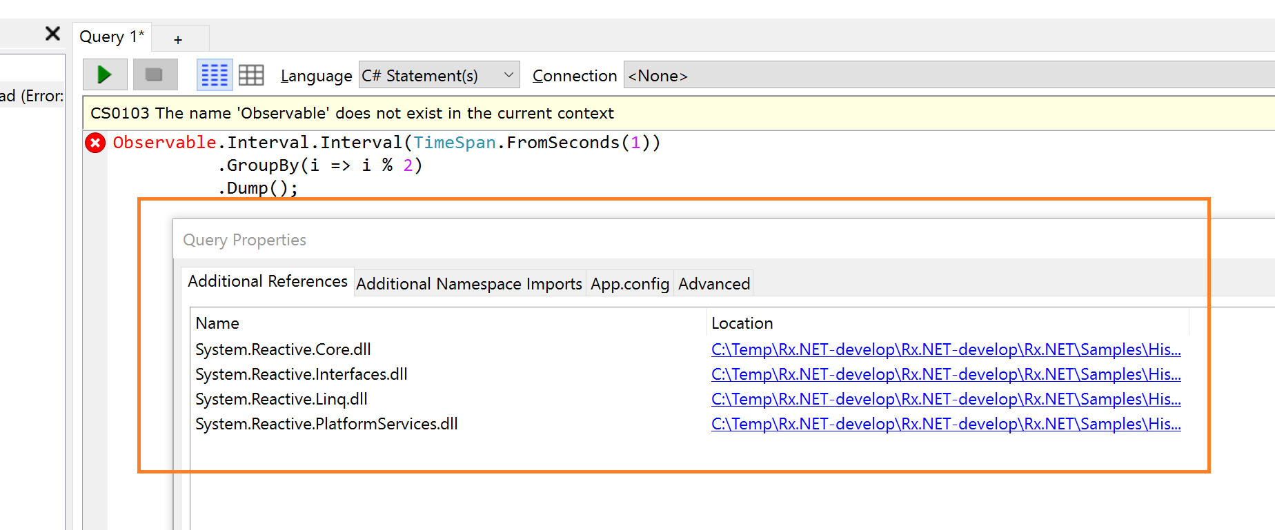 我试图在Rx.NET内部运行LinqPad。我在图片中添加了Rx.NET DLL。