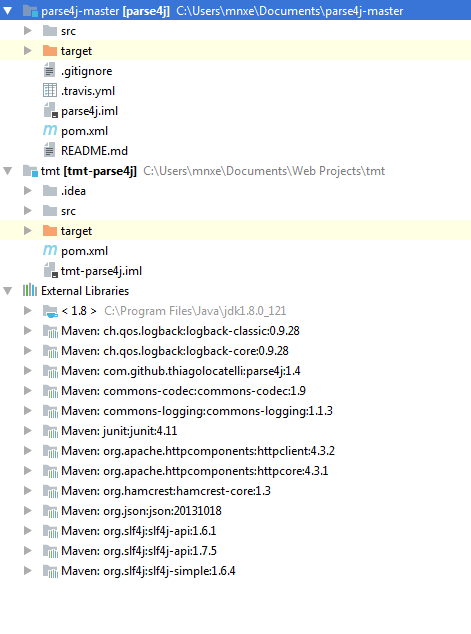 我从Maven下载了一个库,但是需要覆盖其中一个文件中的一个字符串,所以我进入了IntelliJ中的Maven项目选项卡,并从它的pom.xml文件C:\Users\mnxe\Documents\parse4j-master\pom.xml中手动添加了该项目。现在我可以从我的项目文件夹结构中访问.java文件: