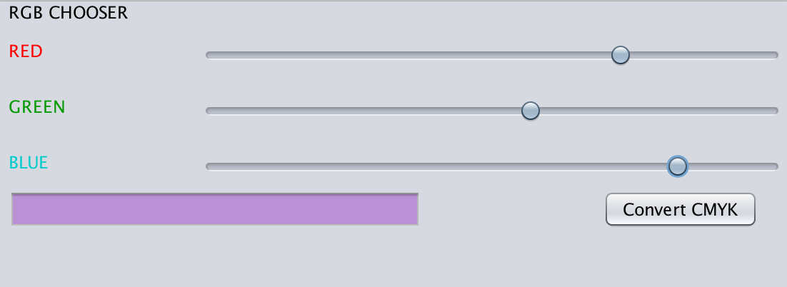 你好。我有一个像上面那样的屏幕。通过使用滑块,我得到了红色,绿色,蓝色。此外,我计算青色,洋红色,黄色和从红色,绿色,蓝色为CMYK。我的问题是,有没有办法用爪哇来显示CMYK的颜色,就像图片中的浅紫色。