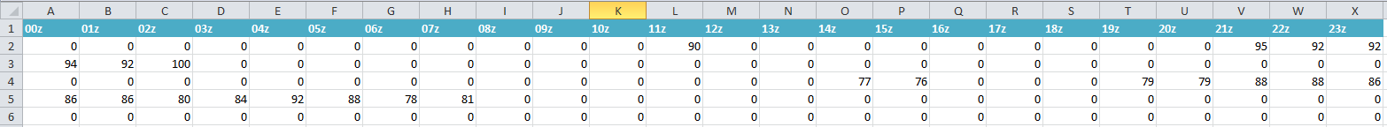 下一个活动的持续时间为11个小时。我试图让excel找到从21z到02z的最大值。因此,BP3 = 6。由于BP3大于0,我试图通过减去持续时间来获得事件的范围(列(C3)-Duration!BP3),从而求出最大相对湿度。对于此事件,最大值为100。