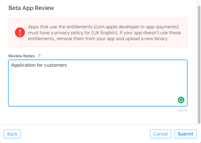 使用Apple Pay或在应用程序中购买任何应用程序,并希望将其上传到testflight上,您必须得到它的隐私政策。
