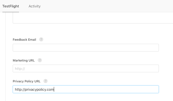 I必须在TestFlight ->测试信息->隐私策略URL下添加隐私策略URL,并添加任何特定的隐私URL..