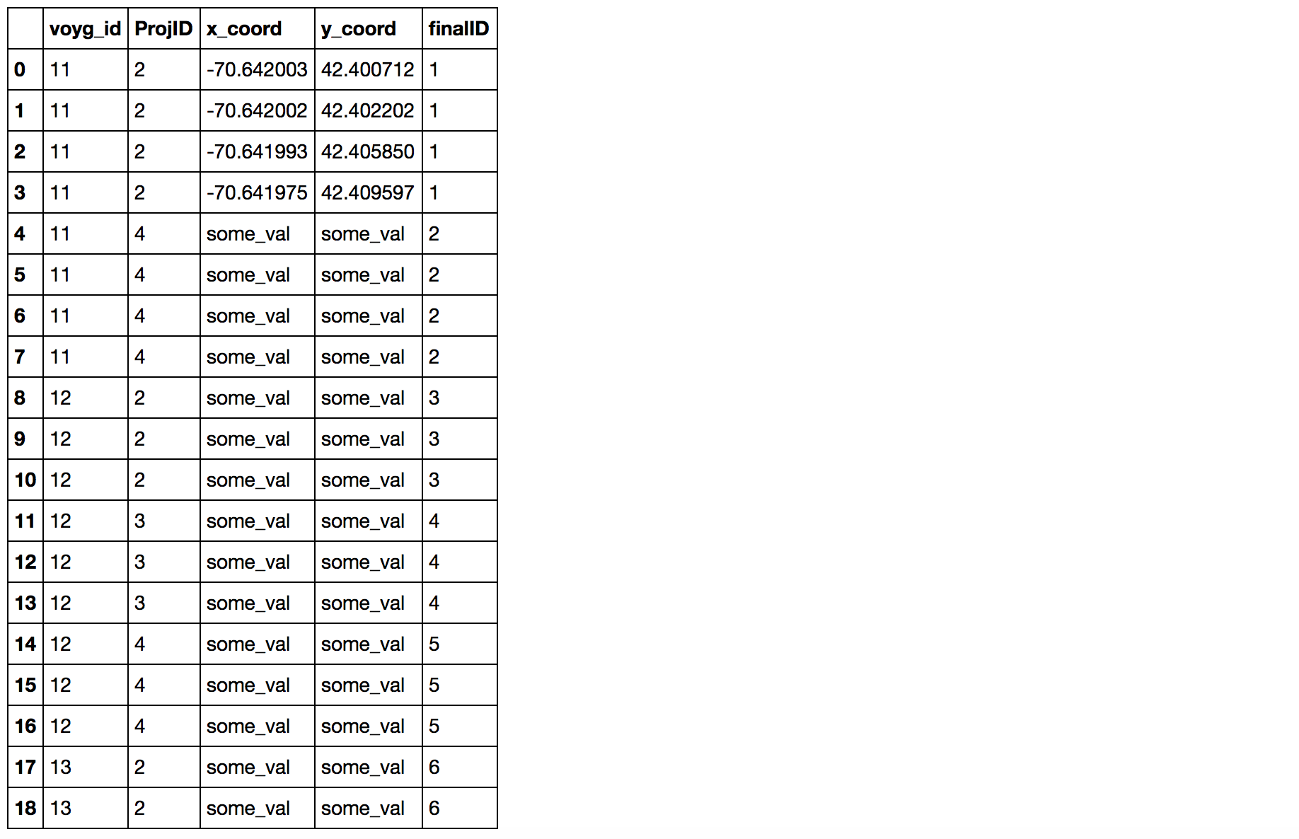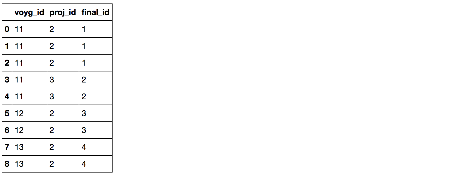 df['final_id'] = ((df.voyg_id.diff() != 0) | (df.proj_id.diff() != 0)).cumsum()