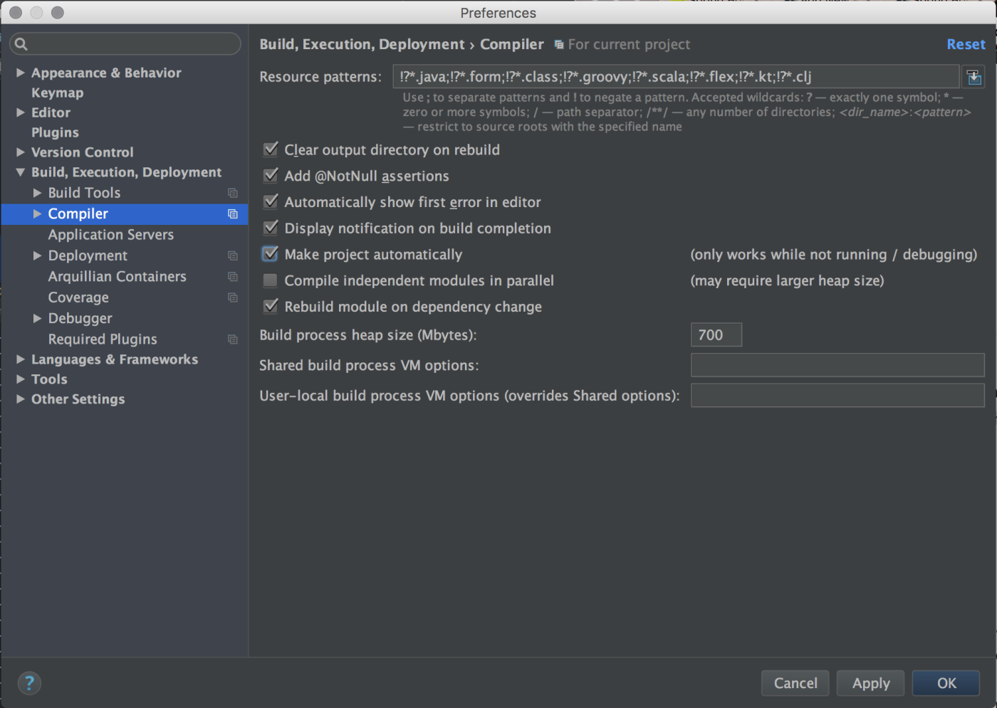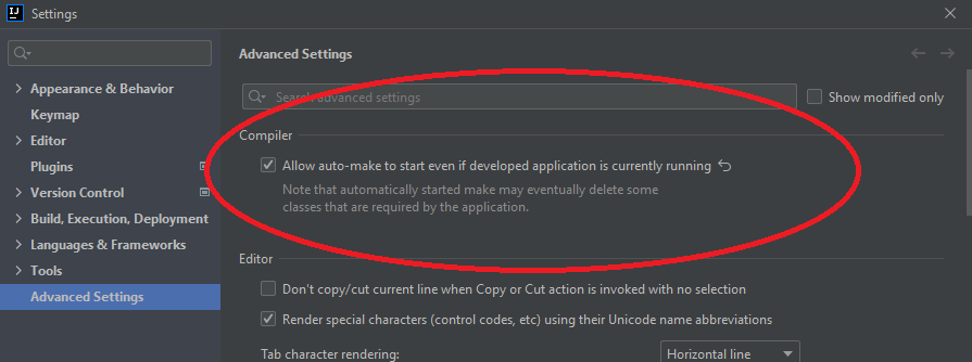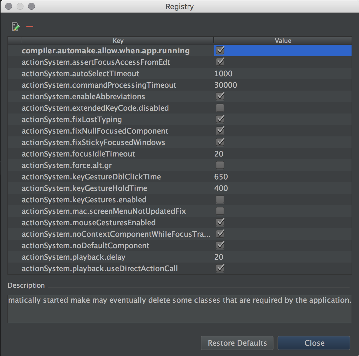 3.在compiler.automake.allow.when.app.running中启用IntelliJ注册表设置。您可以使用快捷方式IntelliJ访问Shift+Command+A中的注册表,然后搜索注册表。