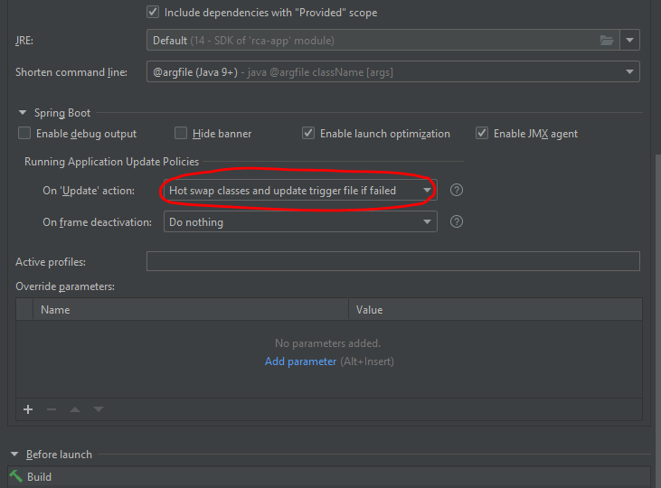这里的关键步骤是将On 'Update' action Hot swap classes and update trigger file if failed设置为。