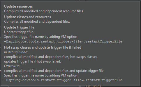 下面是工具提示对各种选项的解释。只指定Update classes or resources可以工作,但是应用程序的部分将被重新加载,但比从头启动应用程序要快得多。请看Restart vs Reload 文件的一节,以作解释。