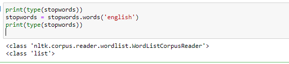 stopwords=stopwords.words('english')在第一行之后,stopwords是一个具有words()方法的语料库阅读器。在第二行之后,是一个列表。照此进行。