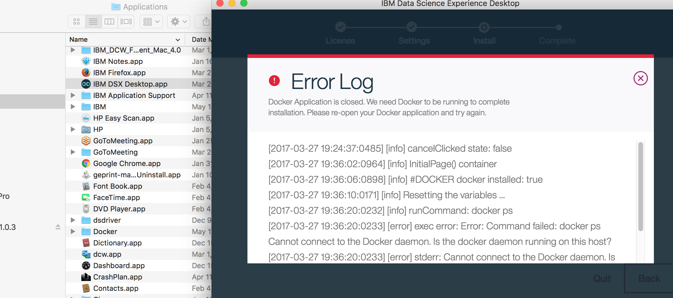 在我的笔记本电脑上安装DSx桌面有问题。我有码头运行(基特列),我必须以某种方式运行码头守护进程吗?