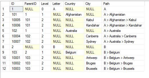Select Distinct ID=ID0,ParentID=null,Level=0,Letter=Lvl0,Country=null,City=null,Path=concat('',Lvl0) from cte0