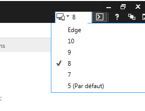 我使用Internet 11,当我单击F12时,我得到了developer窗口,其中特别包含一个组合框,用于选择右上角的Internet版本显示样式。(见下图)