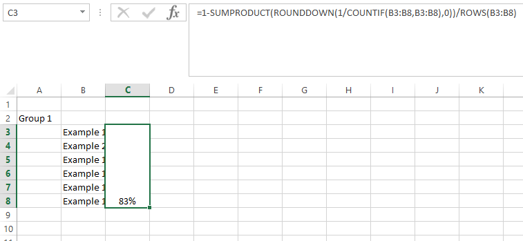 =1-SUMPRODUCT(ROUNDDOWN(1/COUNTIF(B3:B8,B3:B8),0))/ROWS(B3:B8)