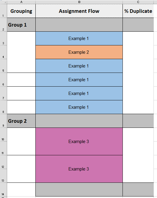 下面的示例电子表格显示了两列。A列包含由两个灰色行轮廓表示的两个不同的分组。B栏包含每个组的“分配模块”。