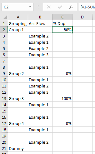 =1-SUM((COUNTIF(OFFSET(B3,0,0,MATCH("*",A3:A101,0)-1),OFFSET(B3,0,0,MATCH("*",A3:A101,0)-1))=1)*1)/(SUM((OFFSET(B3,0,0,MATCH("*",A3:A101,0)-1)<>0)*1))然后,只需复制整个单元格并将其粘贴到每个组的第一行。然后,如果需要,可以重新合并C列中的单元格。