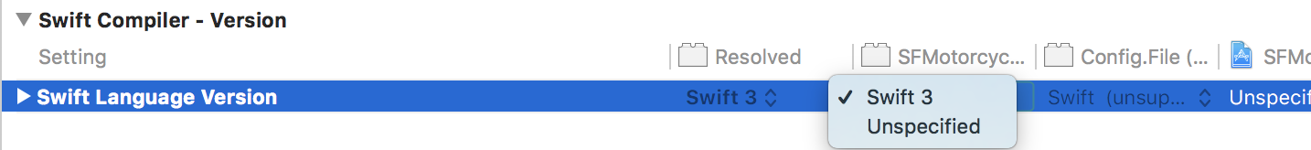 “Swift语言版本”(SWIFT_VERSION)需要为使用Swift的目标正确配置。使用编辑>转换>到当前Swift语法…菜单可选择Swift版本或使用“生成设置”编辑器直接配置生成设置。
