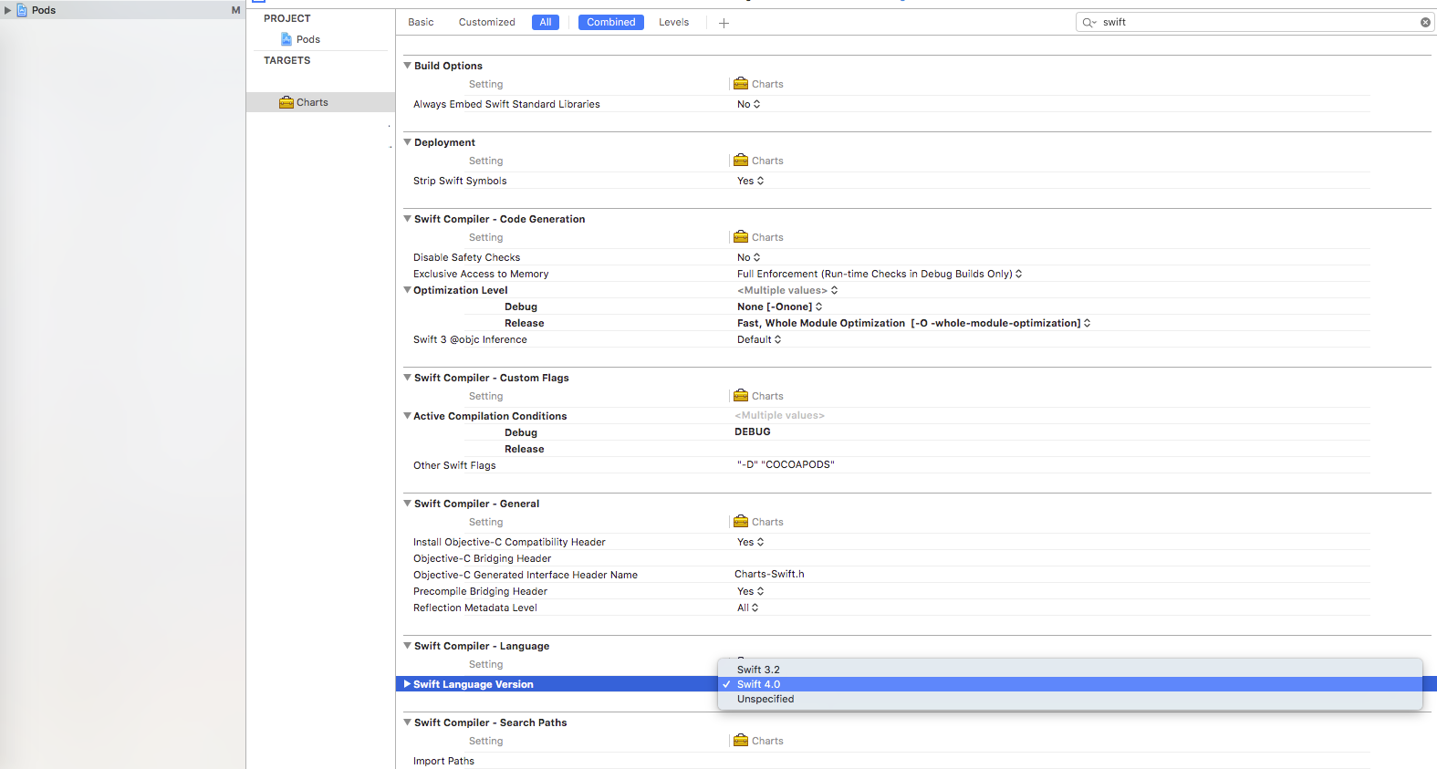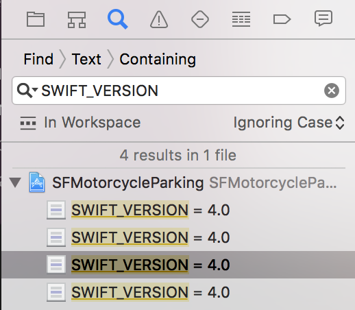 在导航器选择栏中,单击放大镜,然后搜索"SWIFT_VERSION“,您将在项目中找到可以相应调整快速版本的位置。