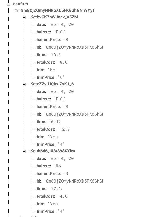 我有一个Firebase数据库。这基本上是给理发店用的。这是所有已经送达(确认)的预订。它当前作为子用户保存用户的Uid。在这个子程序中,它有其他id的值,每个id都有相同的值字段名。