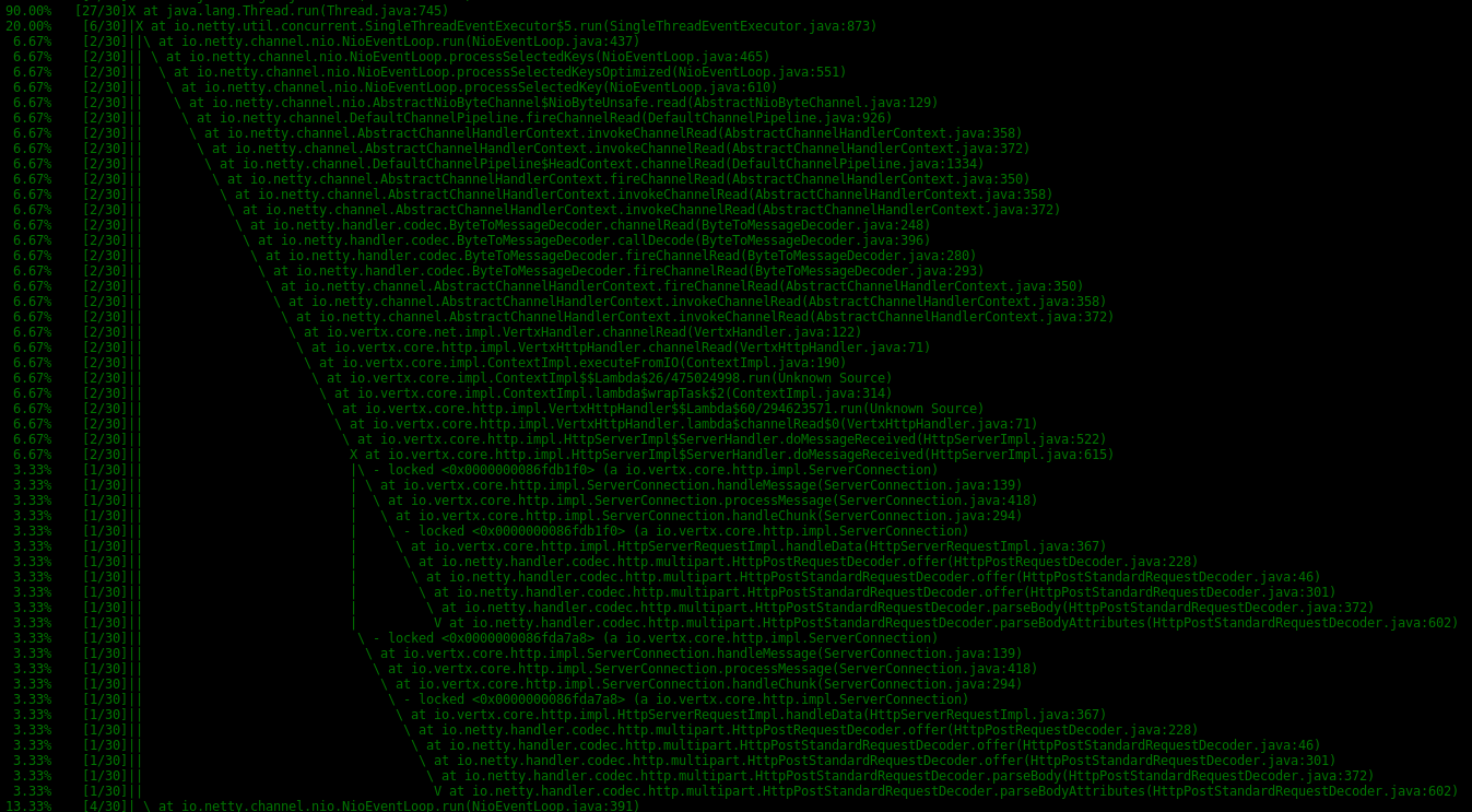 由于请求体处理,我看到一个CPU消耗高于预期的问题。我的简单应用程序是使用vertx构建的。它接受POST请求,断言主体长度与内容长度标头匹配。这个应用程序正在使用一个司机对2个HTTP操作进行基准测试。第一个发送1k,第二个发送8k。每千米利斯一次。身体只是短信而已。